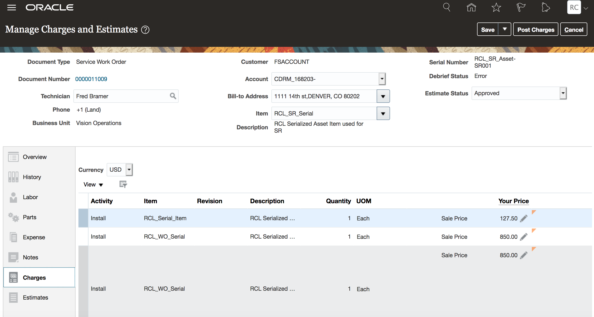 The Charges page allows FS Admins to review part, labor, and expense debrief transactions that were entered into the system by field service technicians.