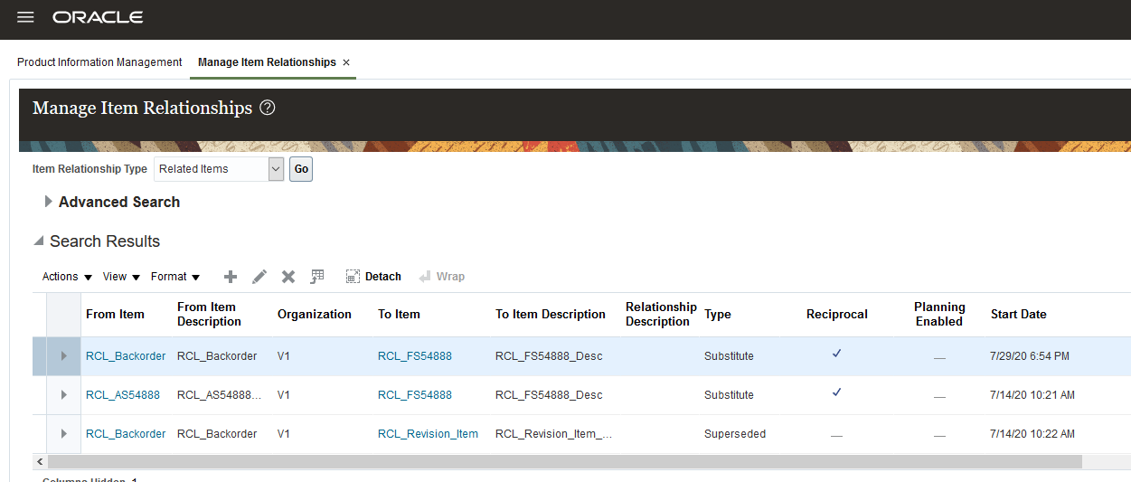The Manage Item Relationships UI below depicts how alternate part relationships for superseded items and substitutes are set up.