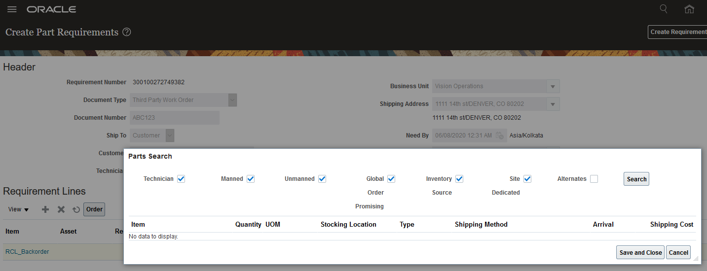 The screenshots below show a part requirement (part item RCL_Backorder) for which no parts could be found using all of the parts search options.