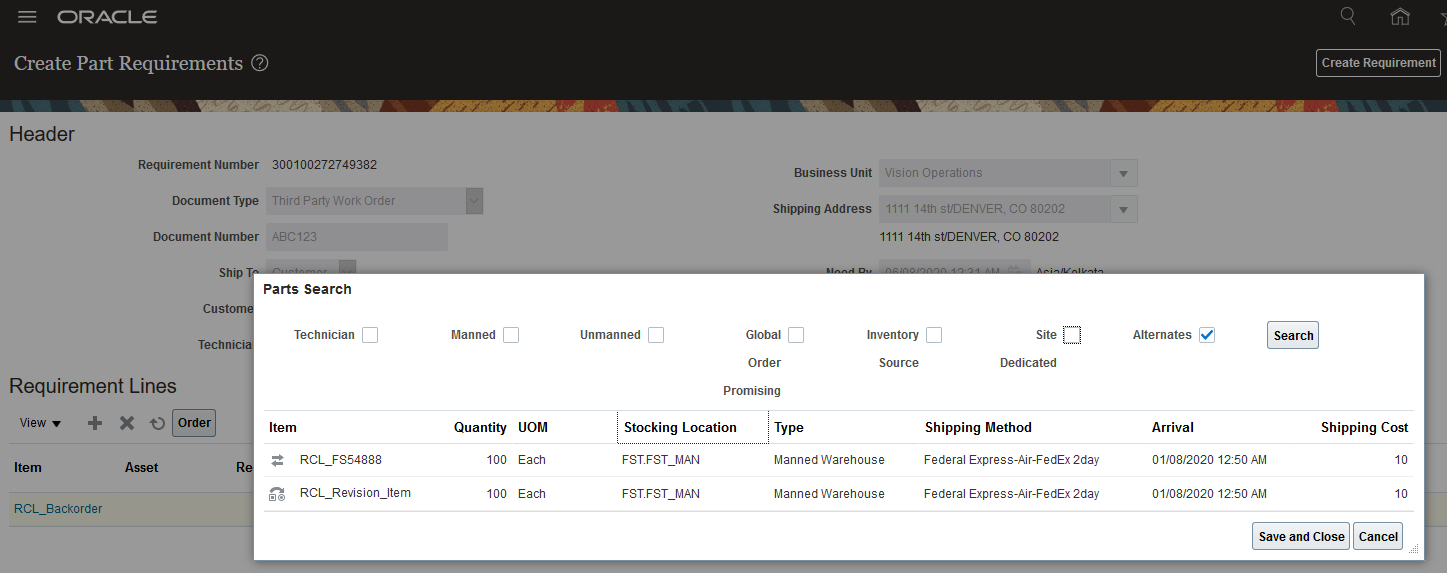 When searching for service parts, this feature provides the option to search for substitute and superseded parts as defined in Product Information Management (PIM) Item Relationships. The option to search for alternate parts has been added to the Parts Search UI. If the Automated Parts Search program does not find the requested parts or finds them in an non-optimal location, you can now search for alternate parts to fulfill the part requirement.