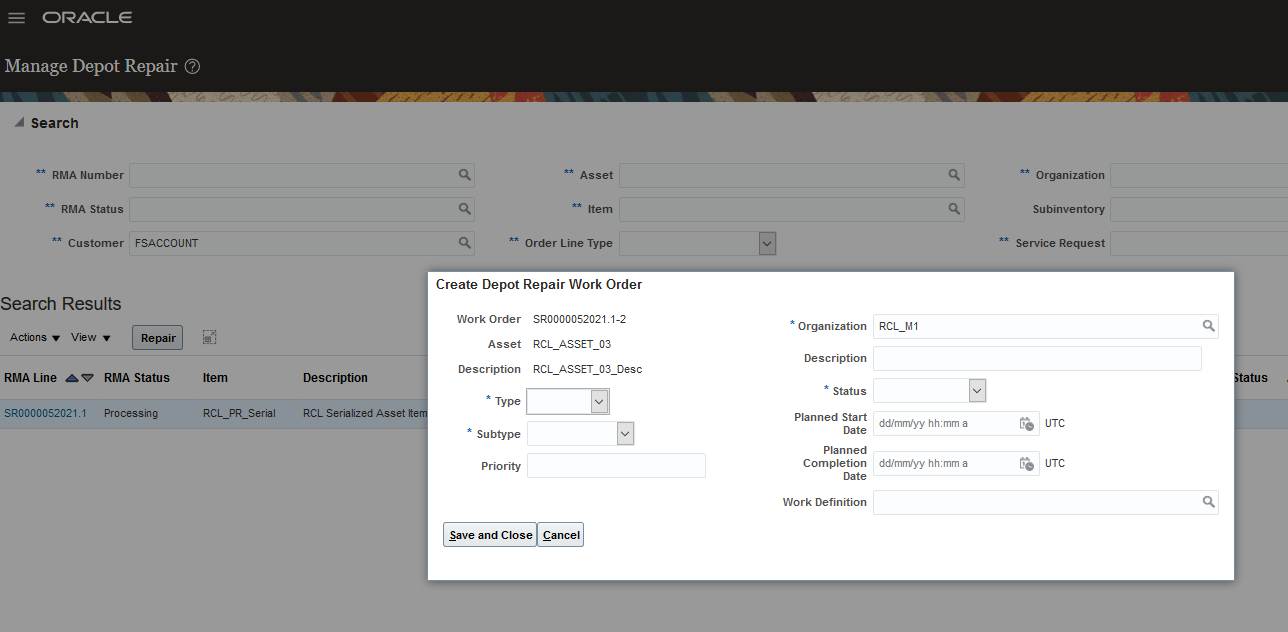 This UI has been enhanced to create multiple work orders for a single depot repair RMA line. The organization that will be performing the work order has been added to the UI. The organization defaults from the current location of the asset being repaired. However, you can change it to any organization that can service the asset’s operating organization as defined in the Manage Maintenance Organization Relationships UI. A sequence number (e.g. -1, -2, -3) has been added to the work order number to clearly identify the each of the work orders created for the repair RMA.