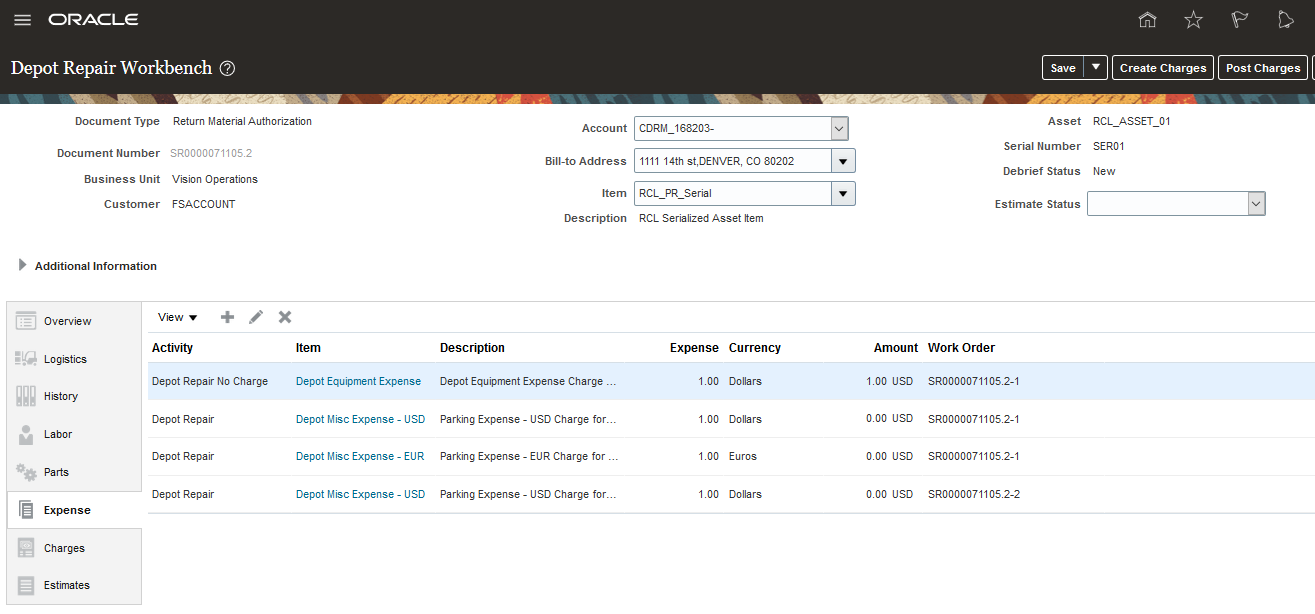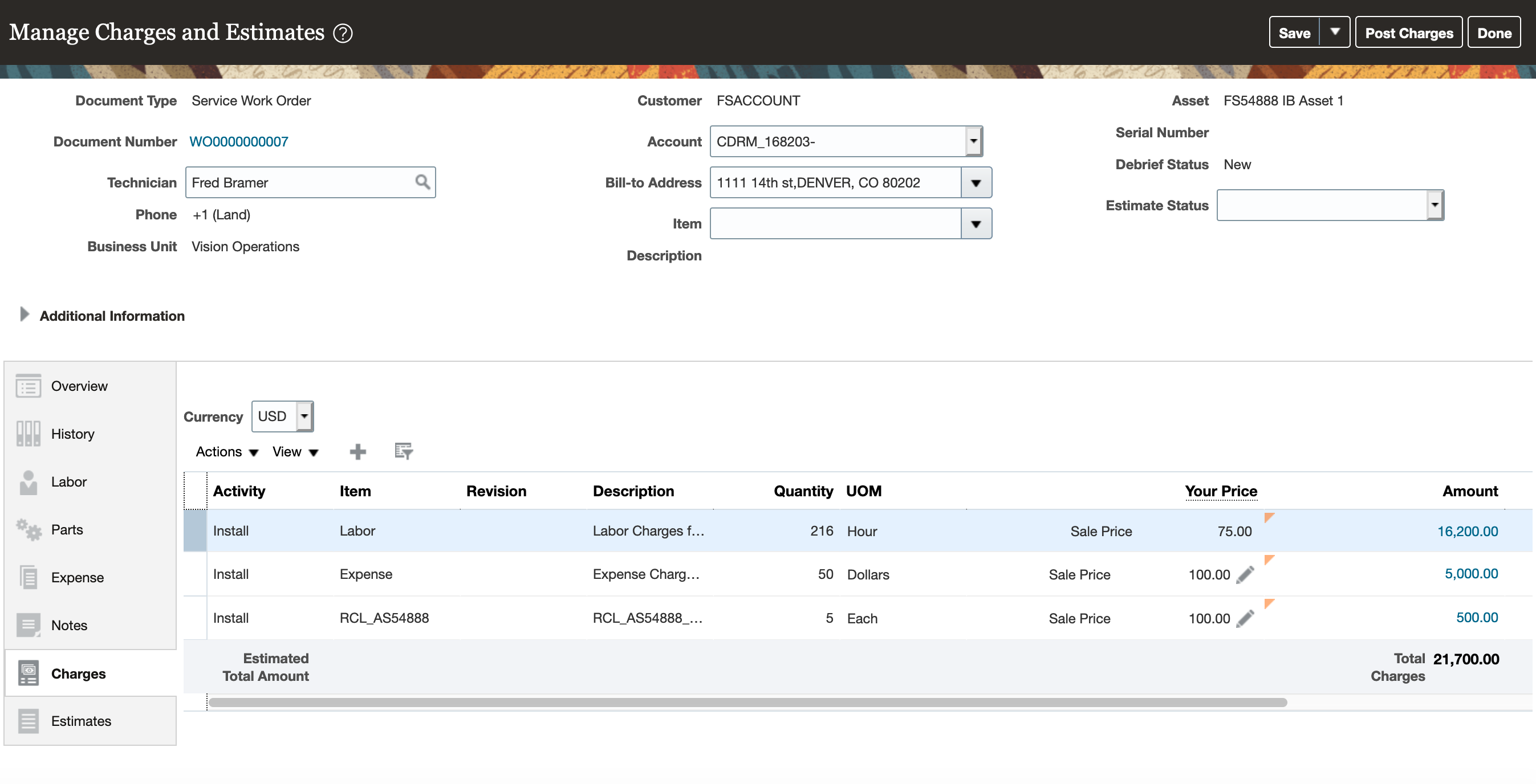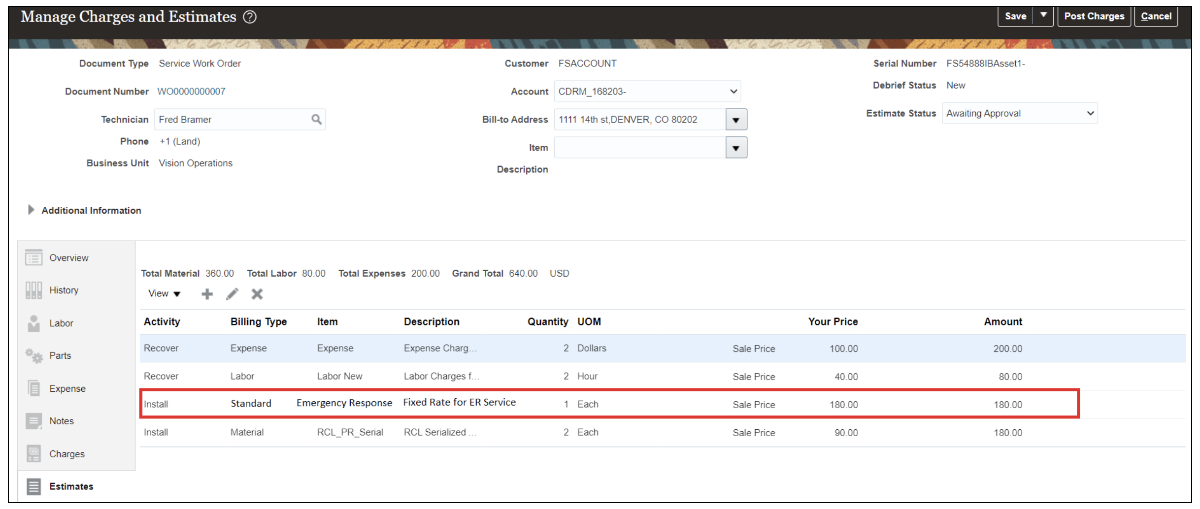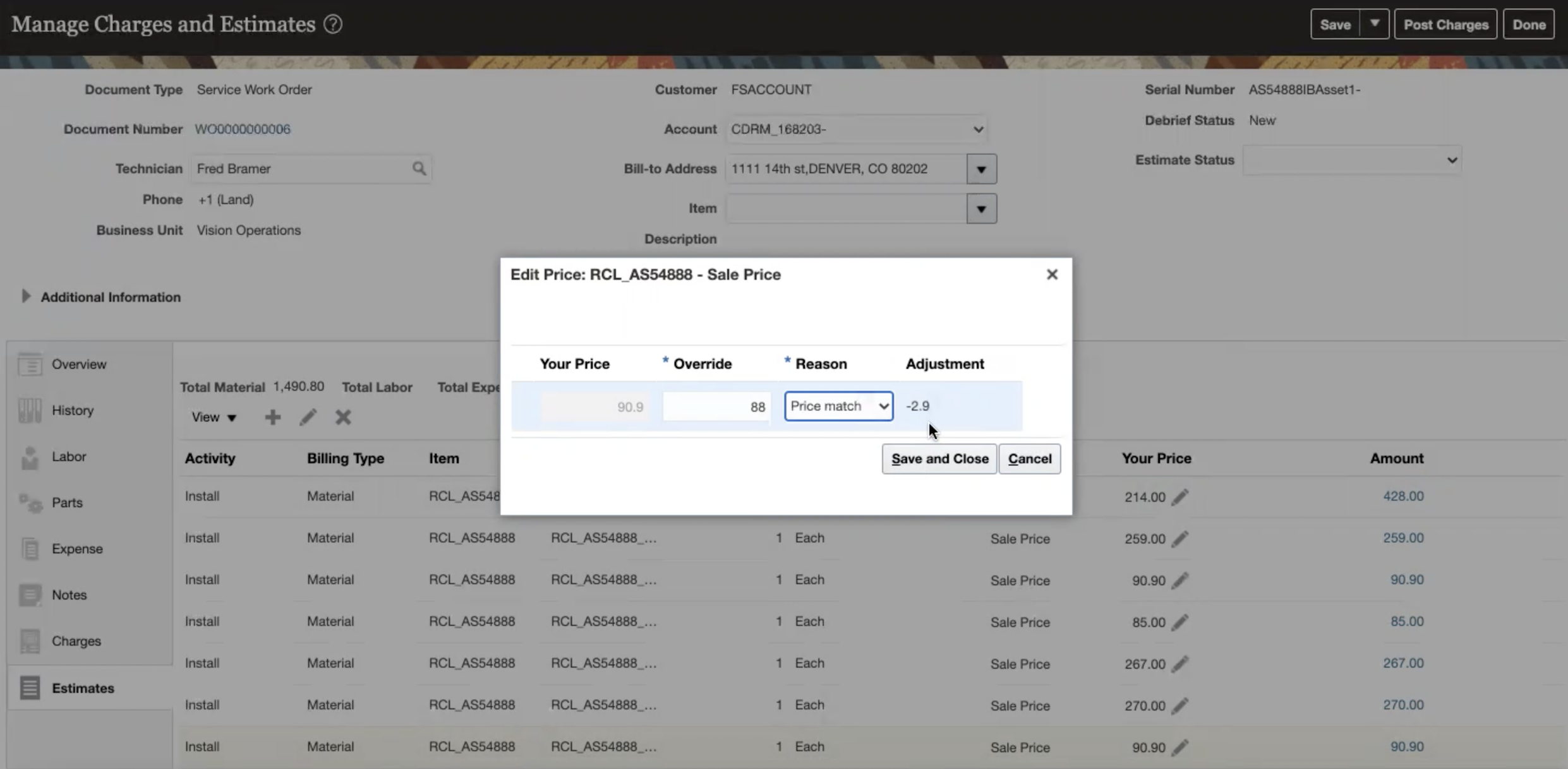 This feature enables you to manually adjust field service and depot repair estimates as well as create fixed charges for flat fee field service and depot repair services.