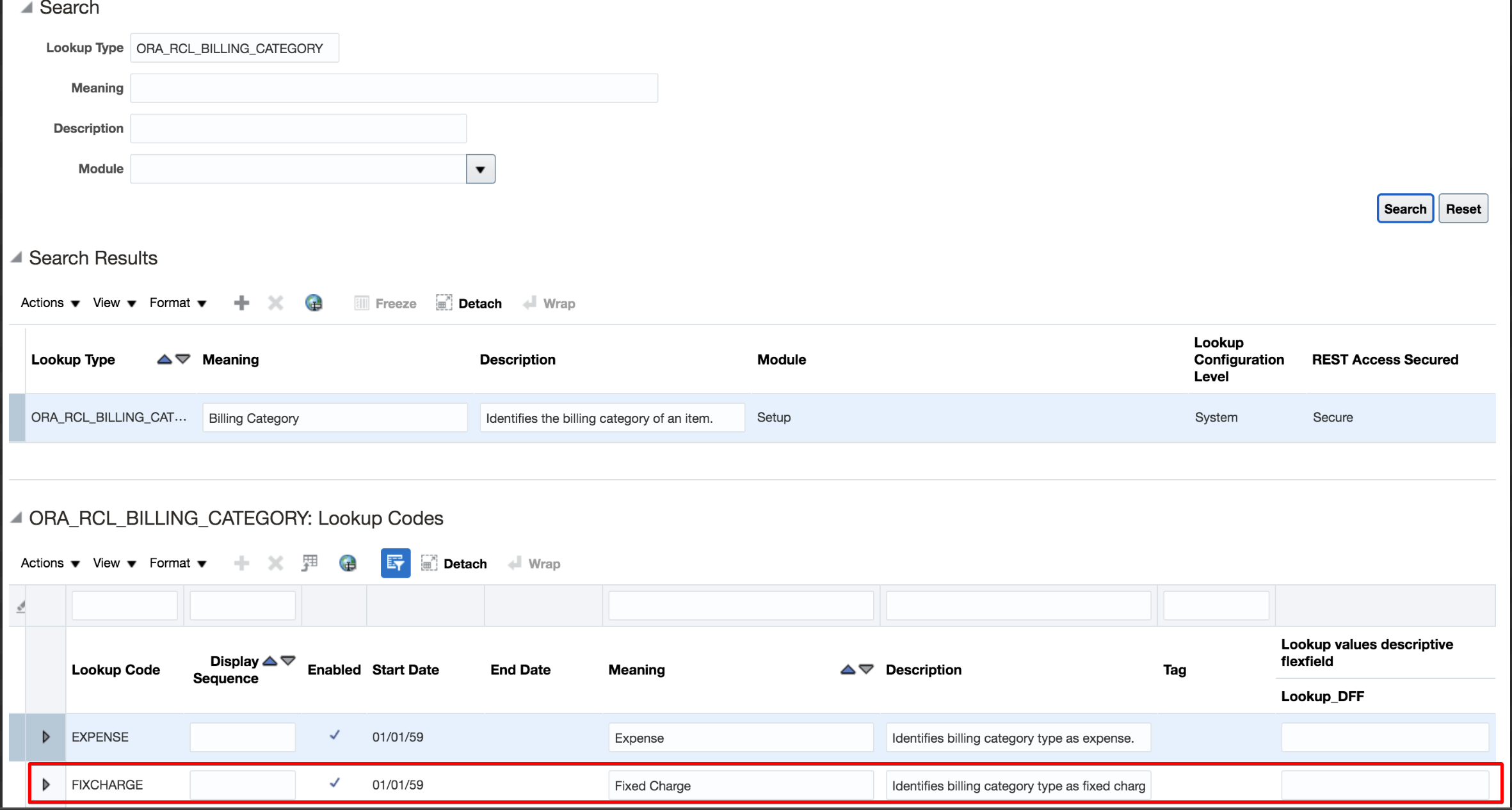 A new lookup code for fixed charges has been seeded in the Service Logistics Billing Category Lookup as depicted in the screen shot below.