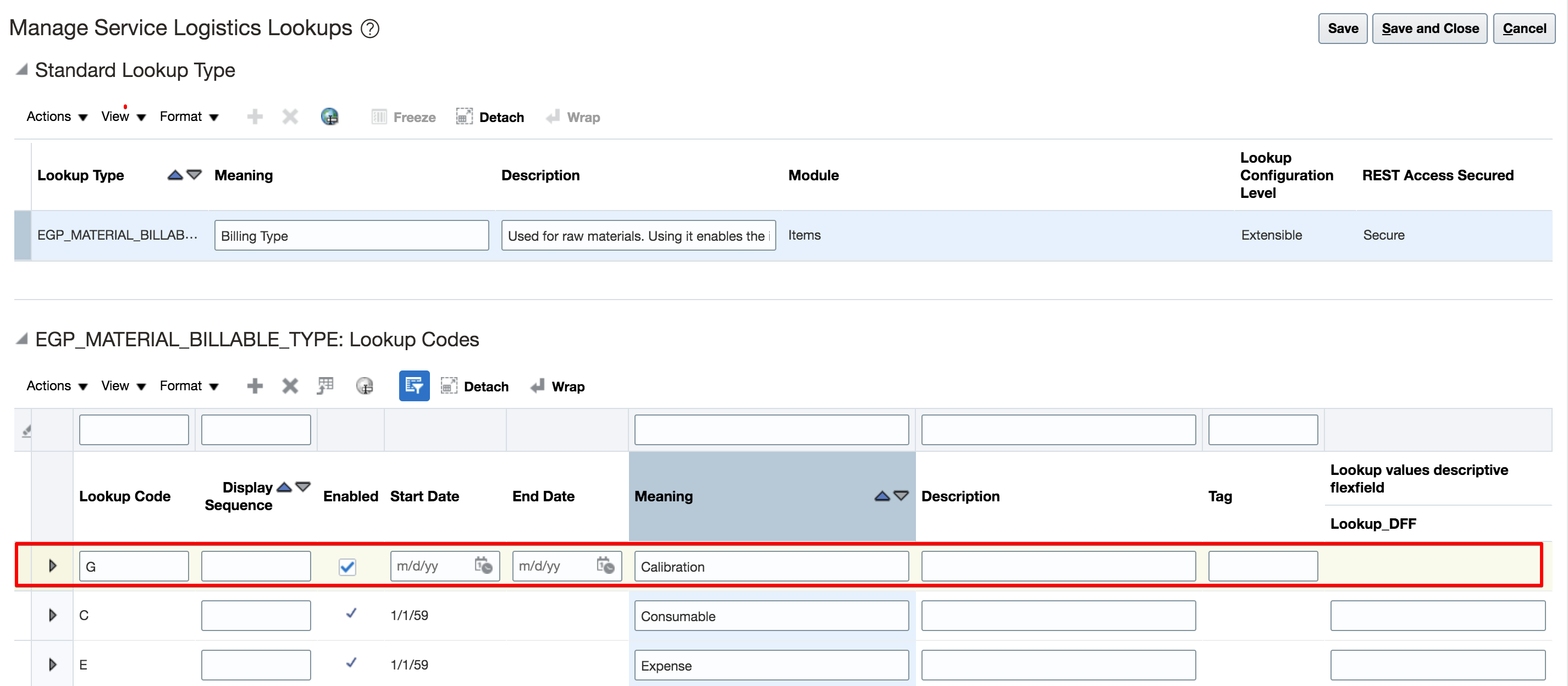 Add new lookups for fixed charges to the Service Logistics Billing Types as depicted in the screen shot below. In this example, a fixed charge billing type is being for a calibration service.