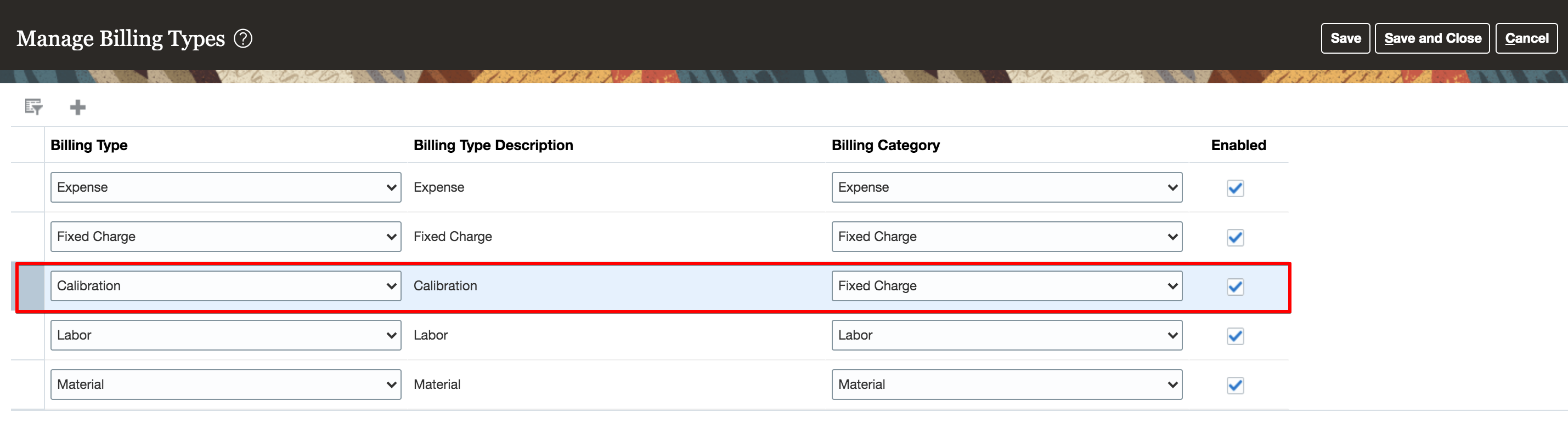 Associate the new fixed charge billing type to the seeded Fixed Charge Billing Category. In this example, the Calibration billing type has been associated to Fixed Charge billing category.