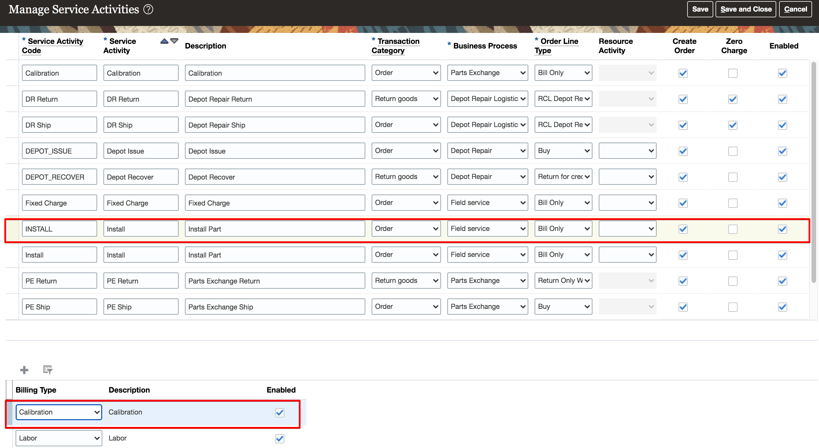 Create a new service activity and associate it to a fixed charge billing type. In this example, the Install service activity code has been associated to two billing types, Labor and the Calibration fixed charge billing type. This association enables the Install service activity to be used to create Installation fixed charges as well as debrief labor and generate labor charges.