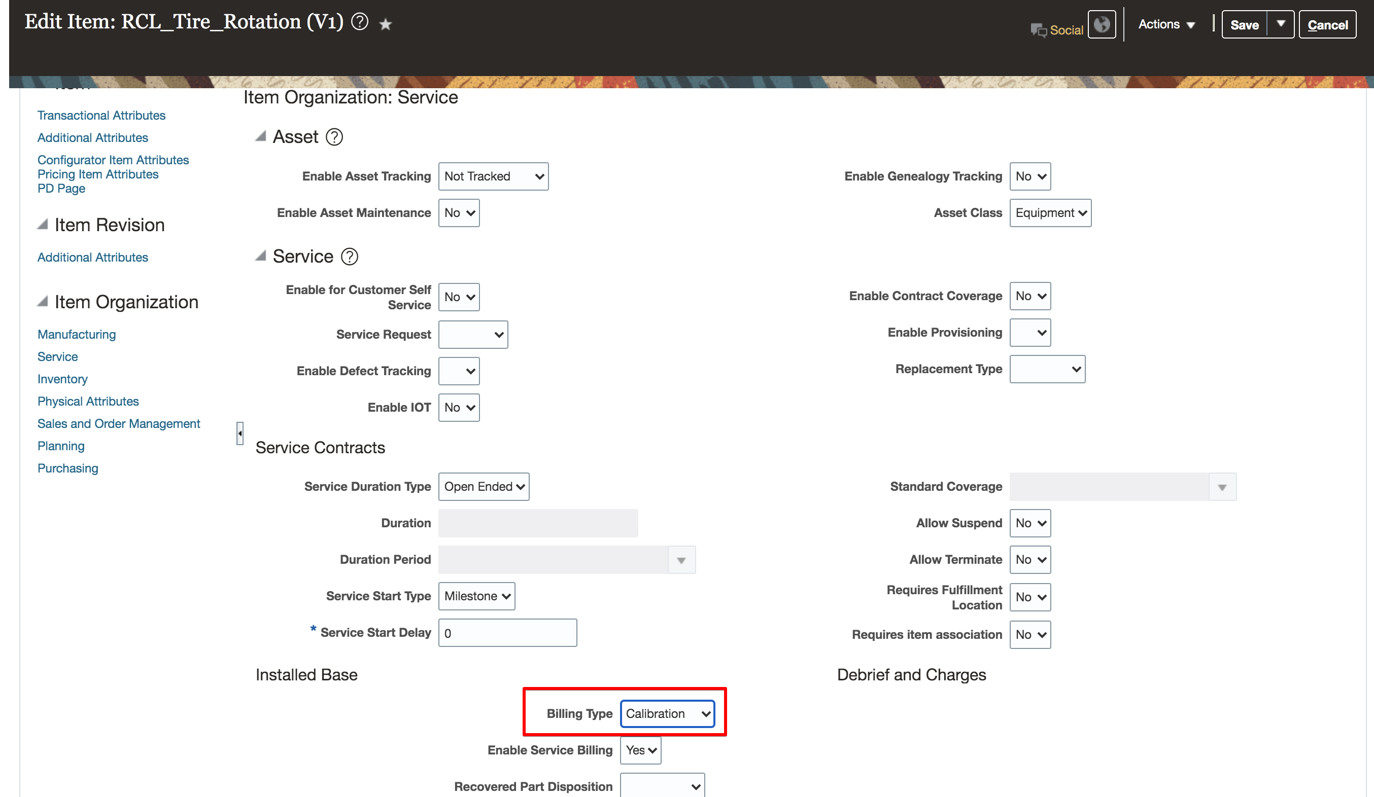 Create fixed charge items in Manage Items UI and then set up pricing for these items in the Pricing Cloud. The item must be created with a fixed charge billing type. In this example, the fixed charge item RCL_Tire_Rotation has been created with fixed charge billing type Calibration