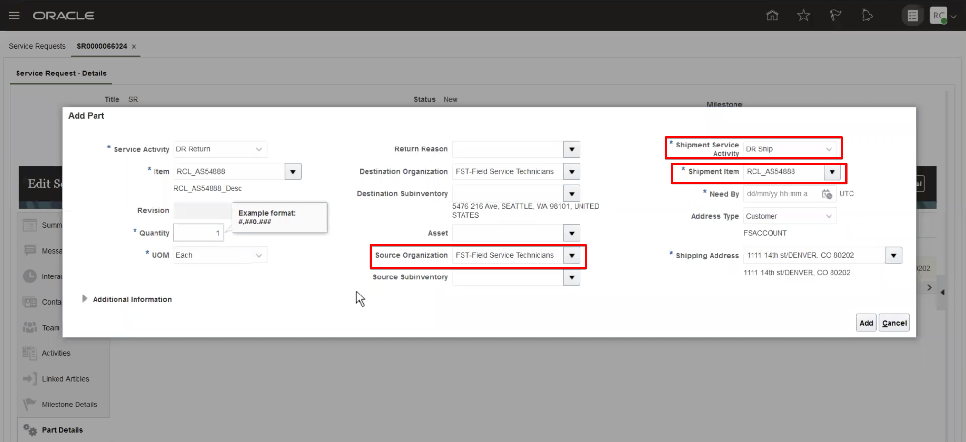 The Destination Inventory Organization (or Subinventory if entered) address is displayed in the Add Part and Edit Part dialog box as well as in the Service Request-Part Details tab.