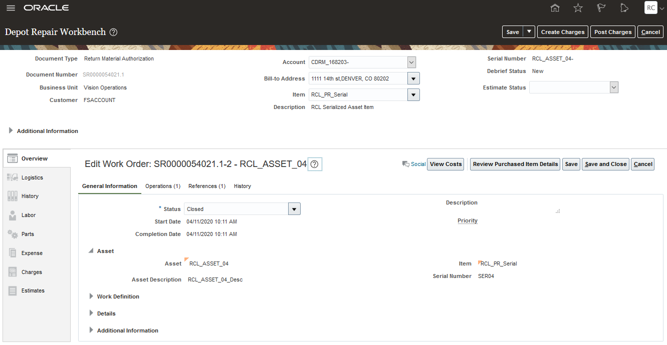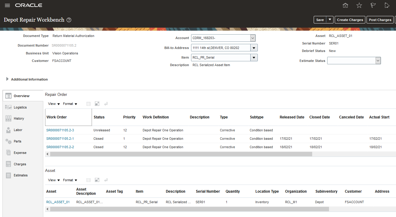- The Depot Repair Work Bench Overview tab now displays all of the RMA order line’s repair work orders. This tab also enables you to drill down to the associated work order UI.