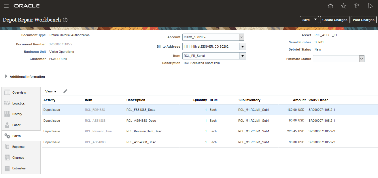 - The Depot Repair Work Bench Parts, Labor, and Expenses tabs now display the work order from which they were generated.