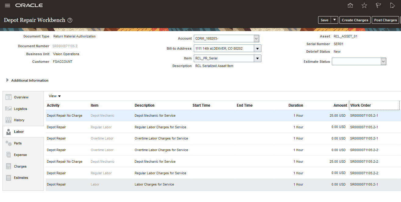 Depot Repair Workbench Labor Tab with Multiple Work Orders