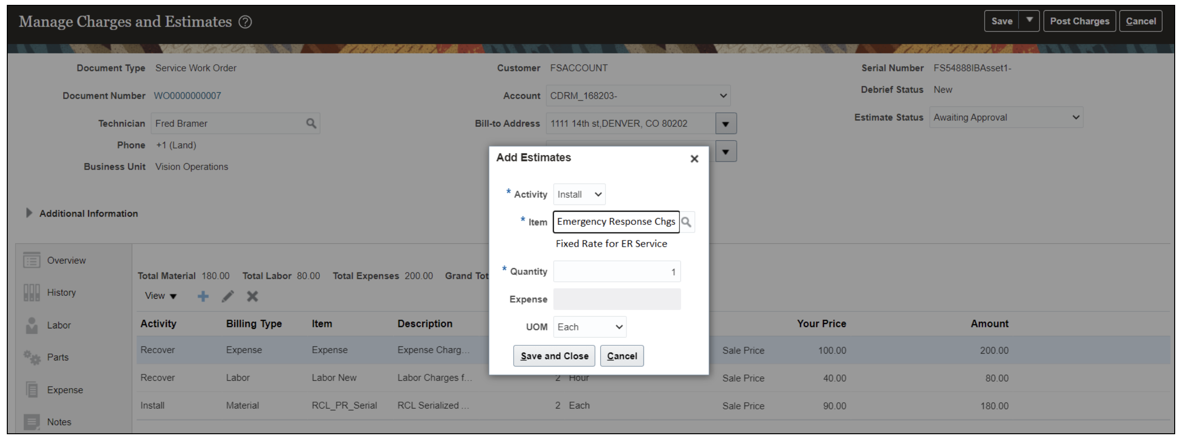 You can now add fixed service charges in both the Charges and Estimates tabs in the Manage Charges and Estimates UI and in the Depot Repair Workbench UI. To add fixed charges, click the plus (+) icon to open the Add Fixed Charge Details UI or the Add Estimates UI. In the example below, an estimate for a fixed Emergency Response charge is being created.