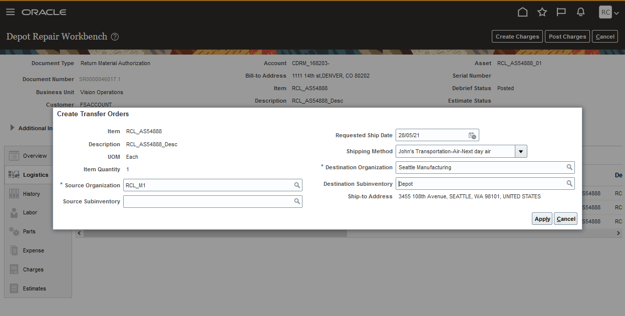 Requested Ship Date and Shipping Method have been added to the Depot Repair Create Transfer Orders UI. This gives the depot repair manager more control over the creation of depot repair transfer orders. Before this enhancement, the requested ship date always defaulted to the current day and time and the shipping method defaulted from the transit times setup form source to destination inventory organizations. In the example below, the depot repair manager has requested that the broken product be shipped to the repair depot on May 28, 2021 using shipping method John's Transportation-Air-Next day air.