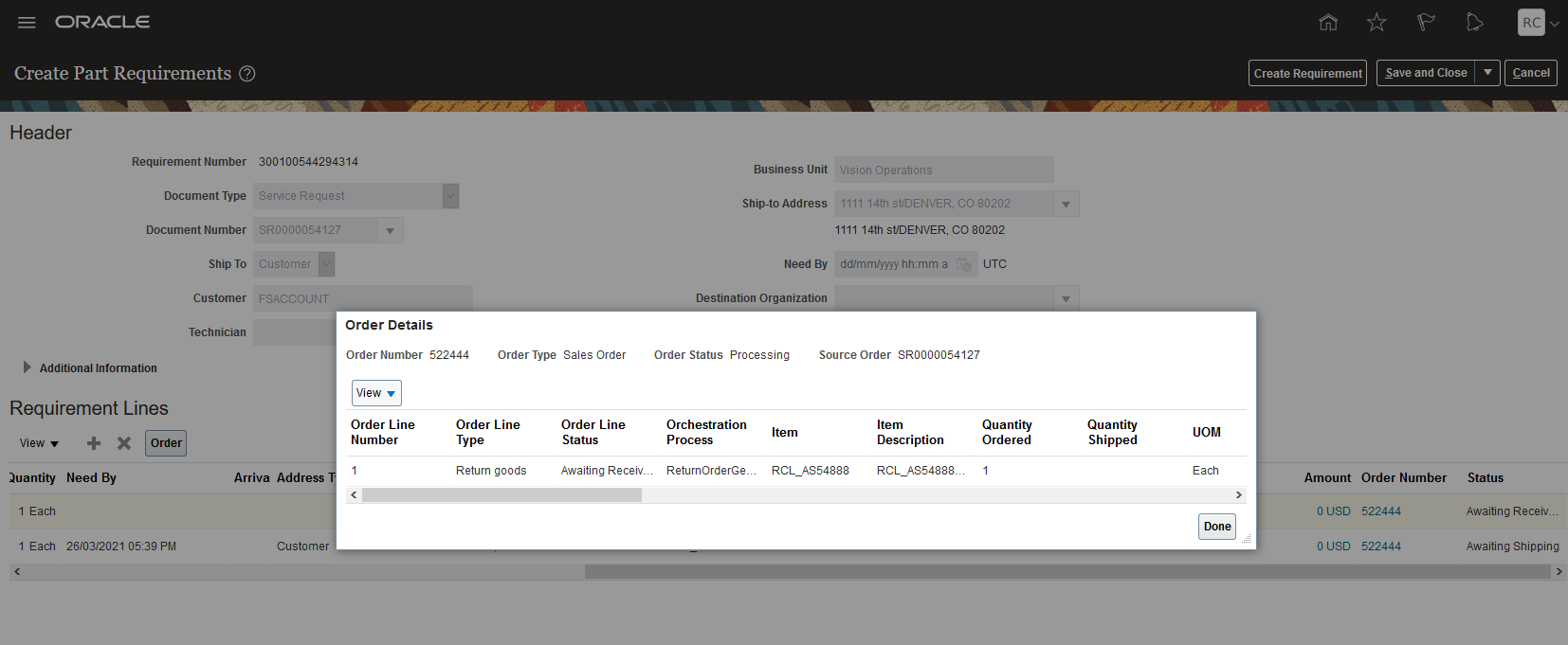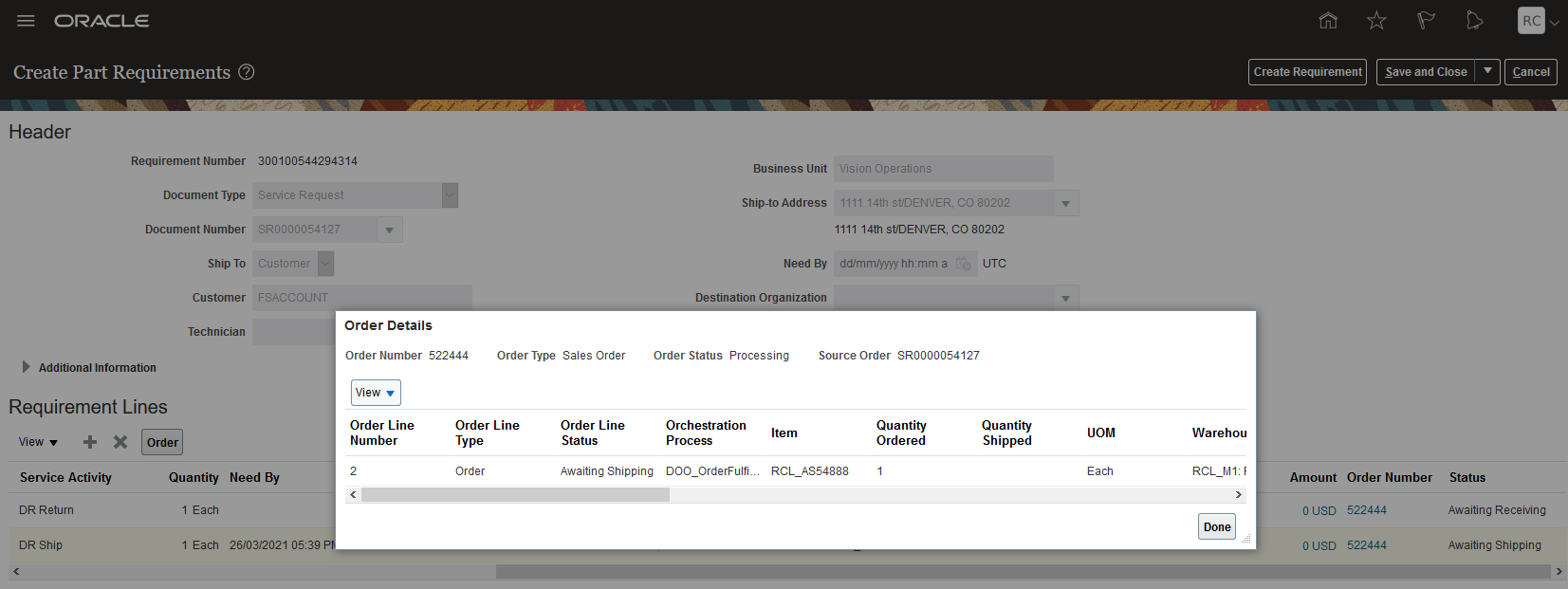 Service Request Part Requirement - Sales Order Details UI - Depot Repair Shipment