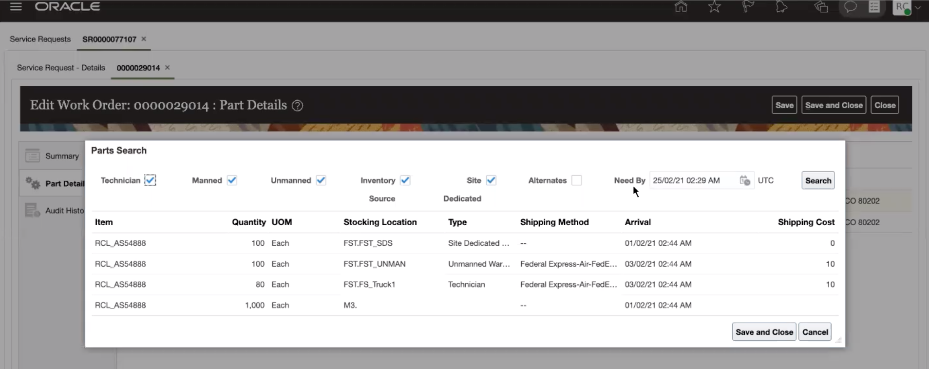 A Need By date field has been added to the Parts Search UI. You can now set need-by dates further out into the future and then search for the required parts when they are not available by the original need-by date set in the Add Part UI.