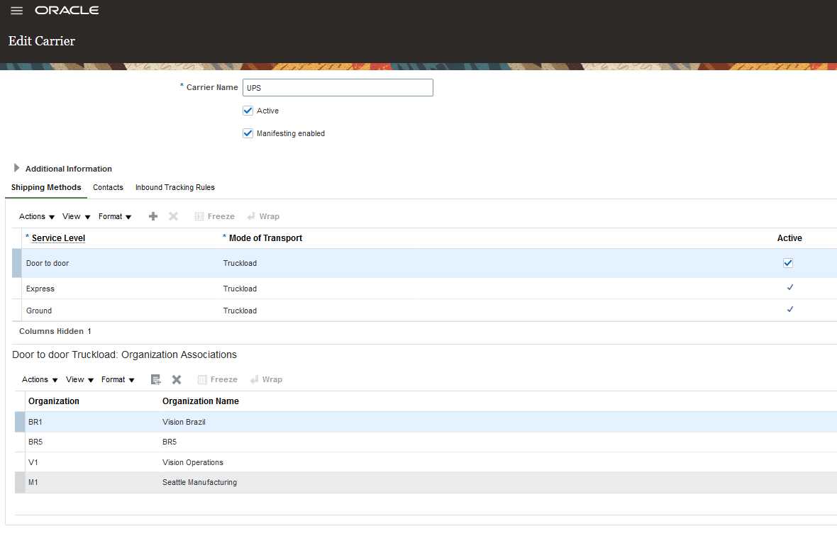 Before you can select shipping methods in the Create Depot Repair Transfer Orders UI, they must be set up in the Manage Carriers UI and assigned to your source inventory organizations.