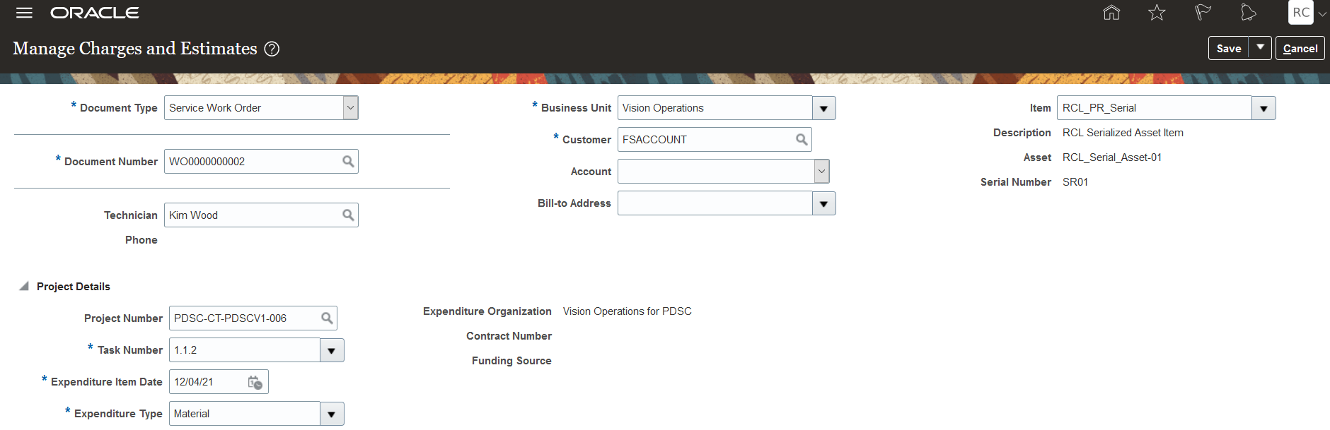Note: For the preventive maintenance work orders that were created in Maintenance Cloud and then converted to field service work orders, the project details association will be retrieved automatically from Maintenance Cloud. For such work orders, the Service Logistics Manage Charges and Estimates page will display the project details in the Project Details region as read-only.