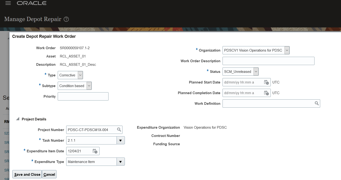 The Create Depot Repair Work Order UI has been enhanced to support the association of project details to the repair maintenance work order being created.