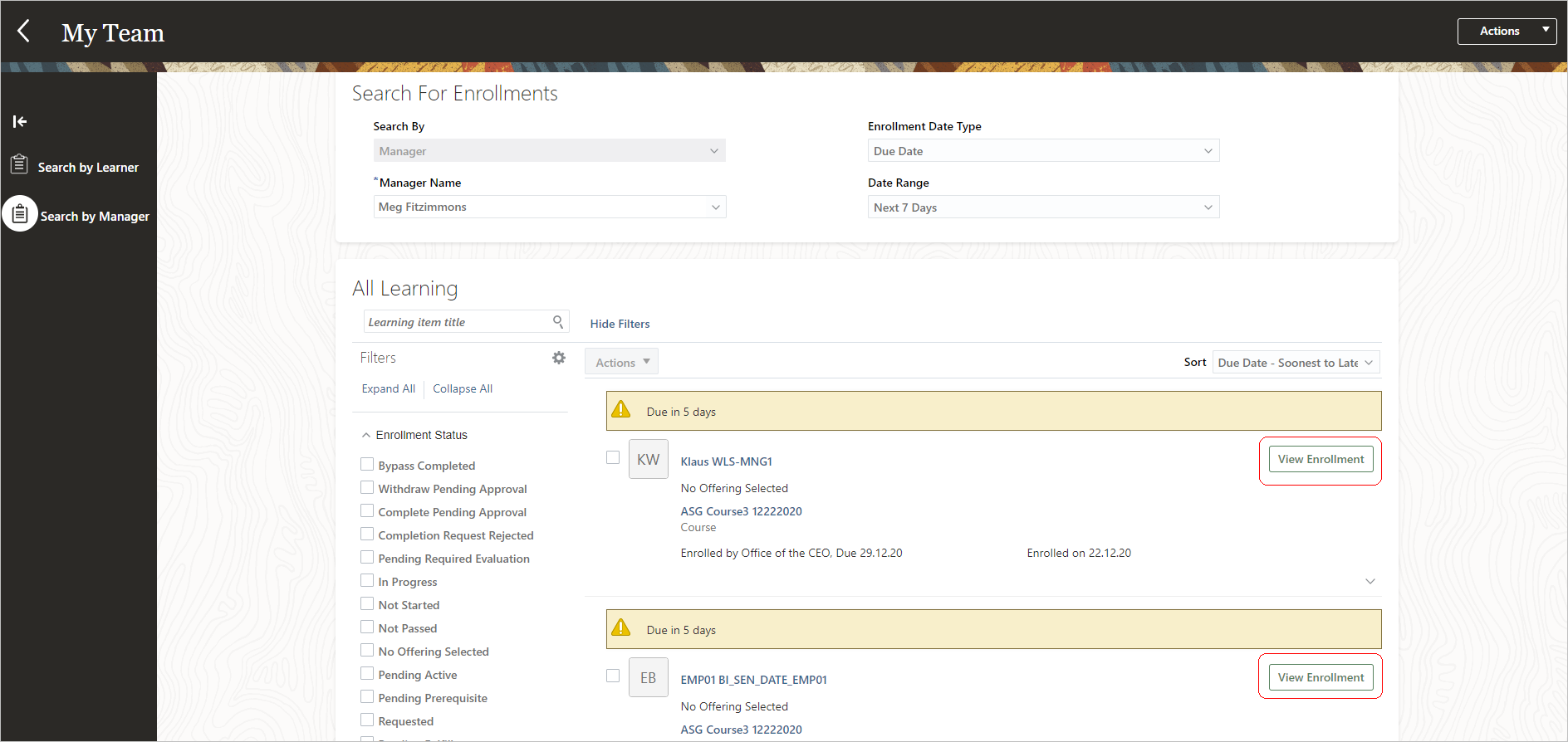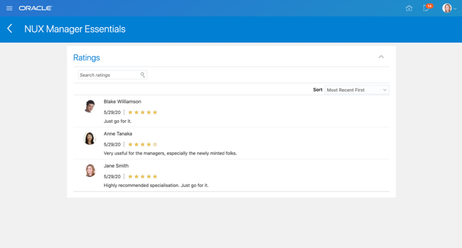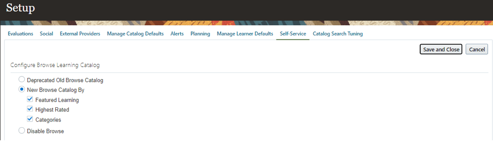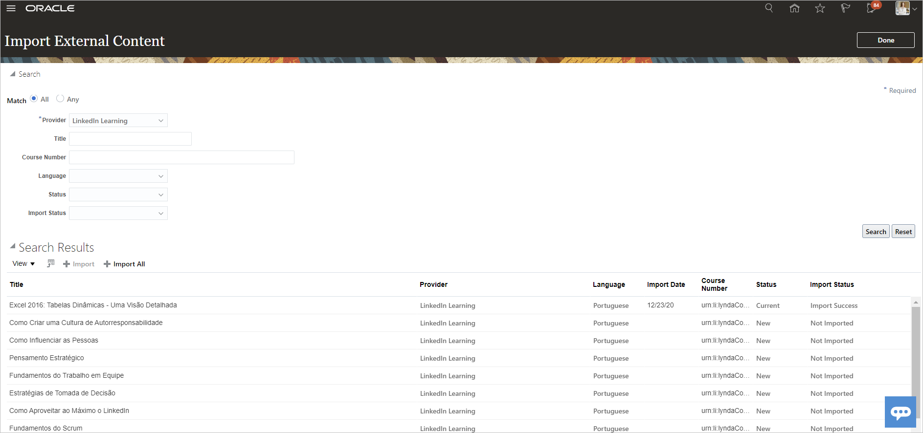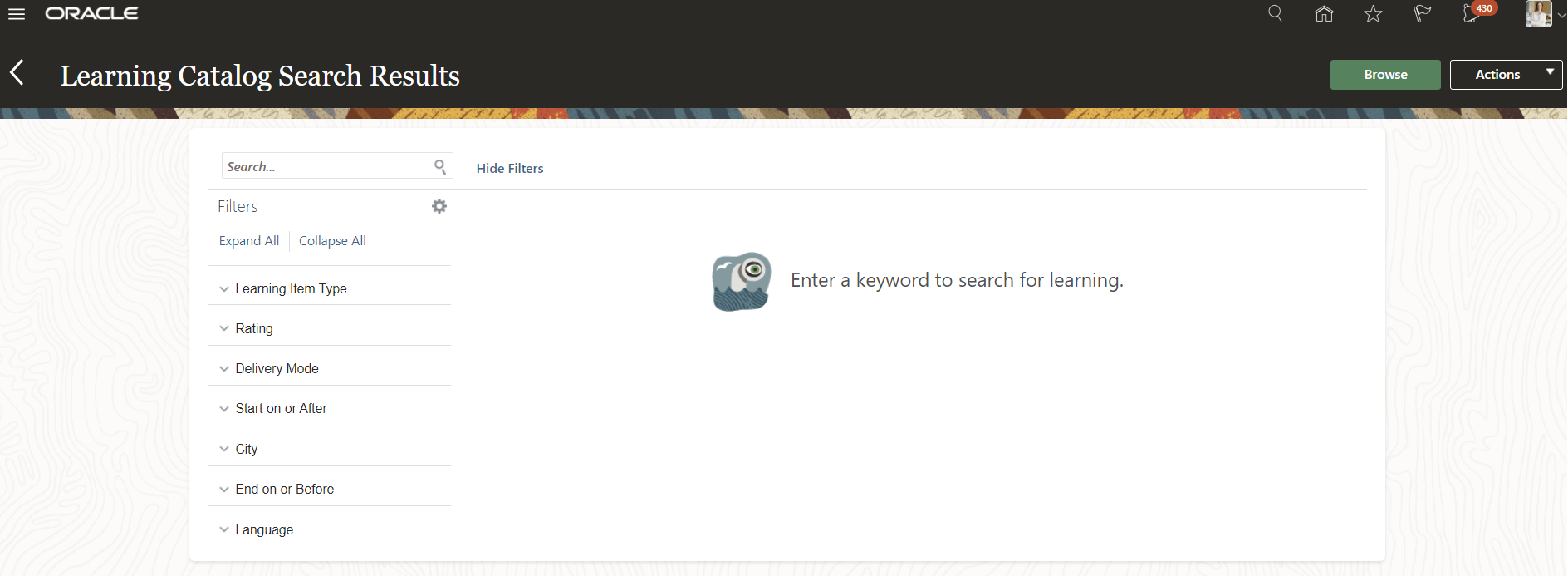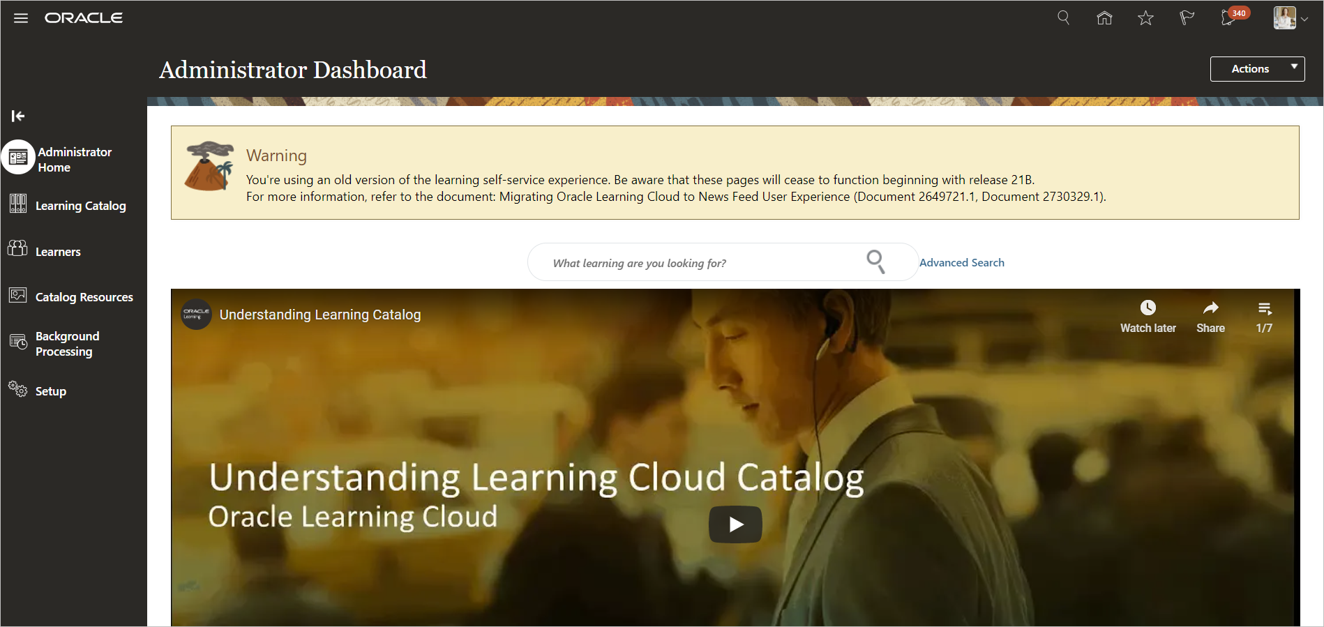 Be among the first to use the next generation search engine. When this feature is enabled, you will notice faster response times, and quality search results, especially for large learning catalogs. This feature enables you to effectively search the learning content very quickly, and with high quality search results. See the What's New in 20D for more details. |