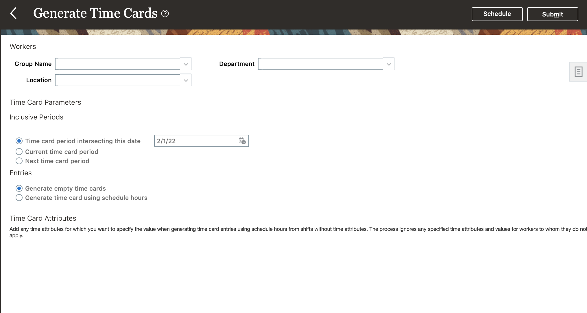 This enhancement makes it easier for time and labor managers to generate the appropriate time cards for the people they support.