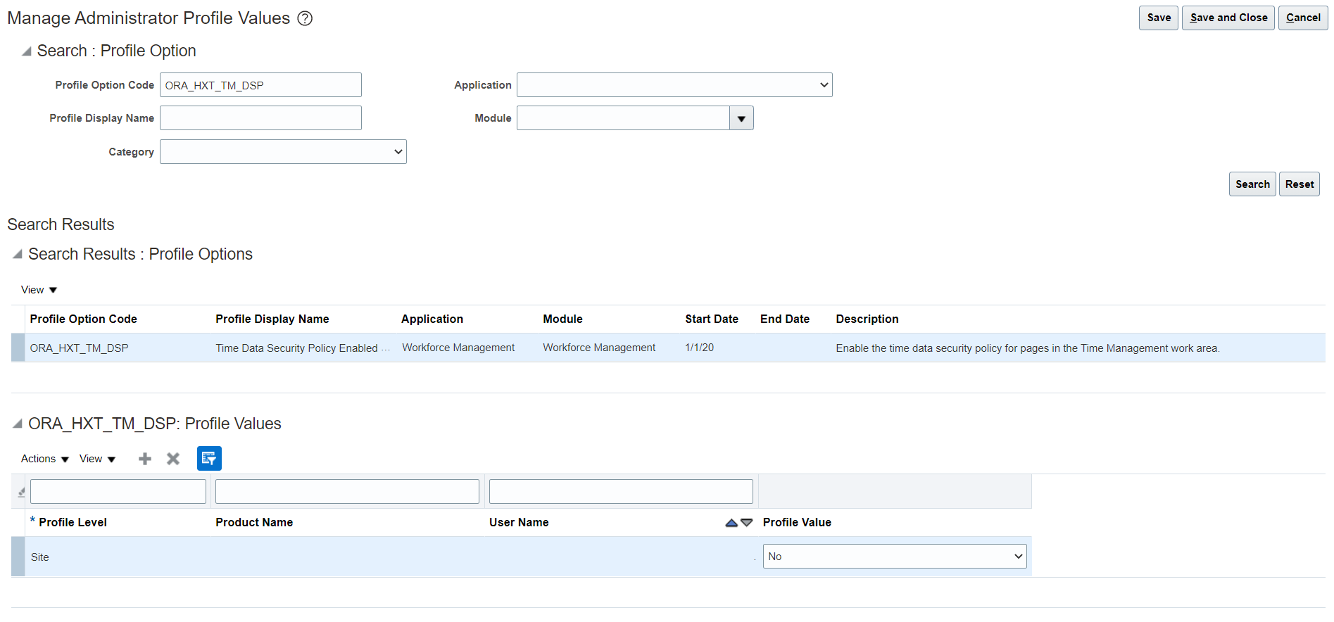 - On the Manage Administrator Profile Values page, in the Profile Option Code field, enter ORA_HXT_TM_DSP.
