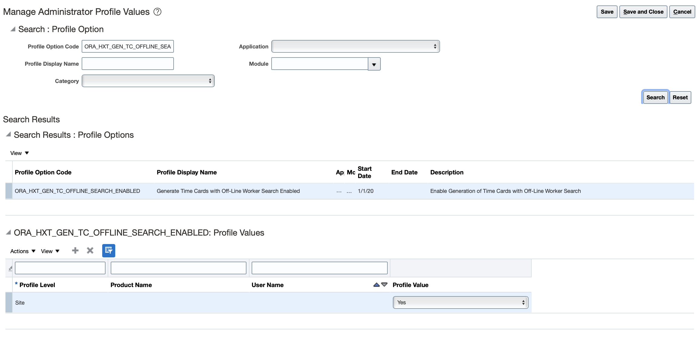 - On the Manage Administrator Profile Values page, in the Profile Option Code field, enter ORA_HXT_GEN_TC_OFFLINE_SEARCH_ENABLED.