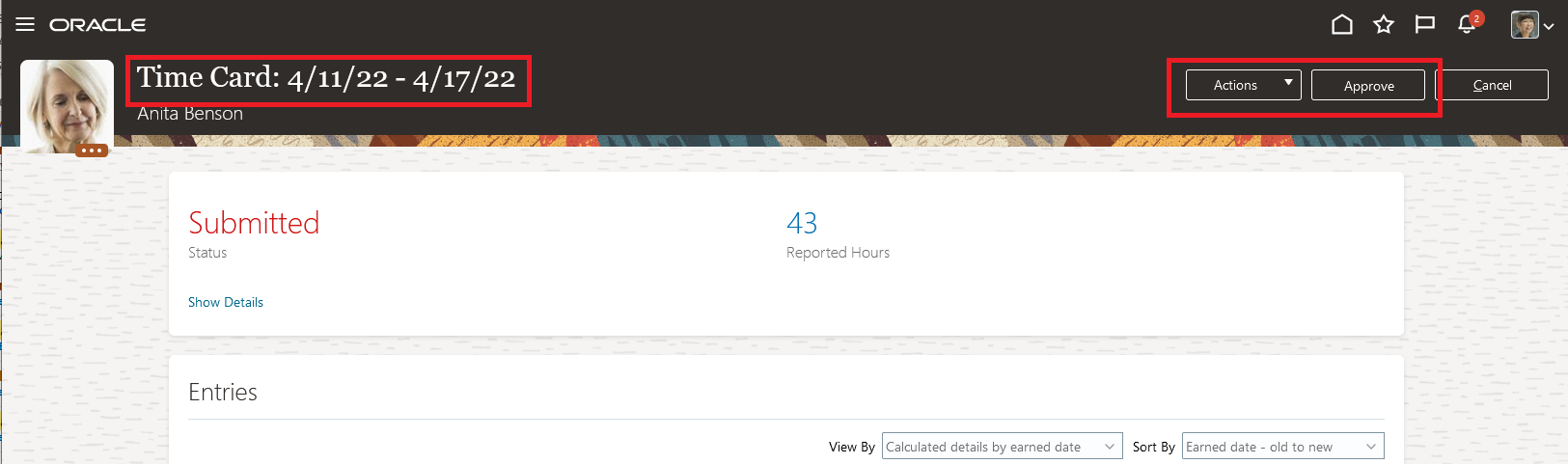 Example Open Time Card Showing the Approve Button and the Actions Menu, which Has the Reject Option