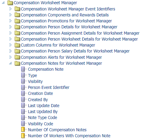 NOTE: While creating analyses using attributes from these two dimensions in conjunction with attributes from other dimensions like Compensation Budget Pools or Compensation Components you must add a metric from either or both of these two folders and a metric from the Compensation Components and Rewards Fact folder.