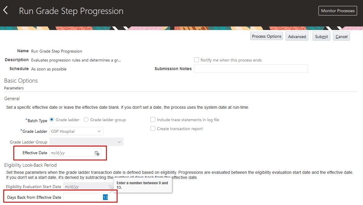 Example 2: Generate HCM Rates process with a start date that is before the salary change