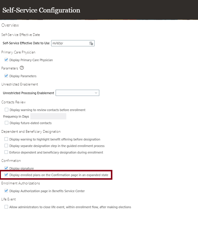 There's a new configuration option (a check box) in the Self Service Configuration page that you need to select to use this feature. It's called Display enrolled plans on the Confirmation and Summary page in an expanded state.