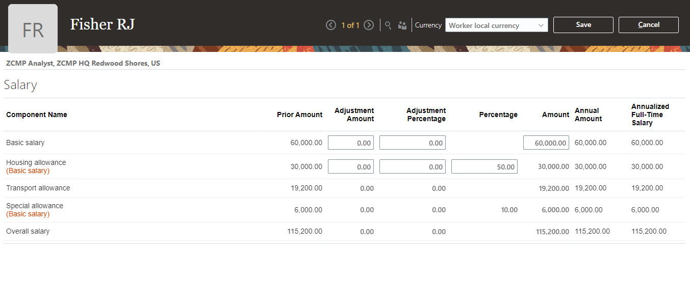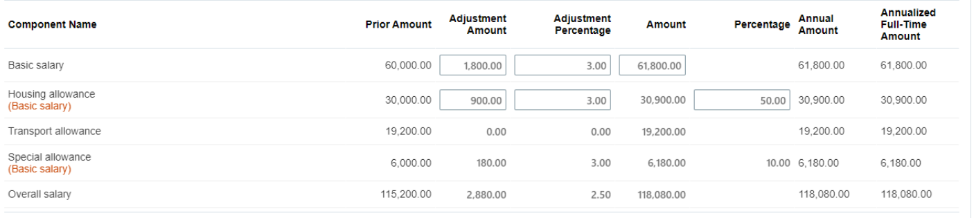 - Payroll - Element Entries History Real Time: the user will be able to access the element entries with respect to that assignment and the corresponding payroll relationship level element entries. Since this is a history subject area, the user will be able to view the past dated entries as per the assignment security. For example, an employee has the following assignment history: