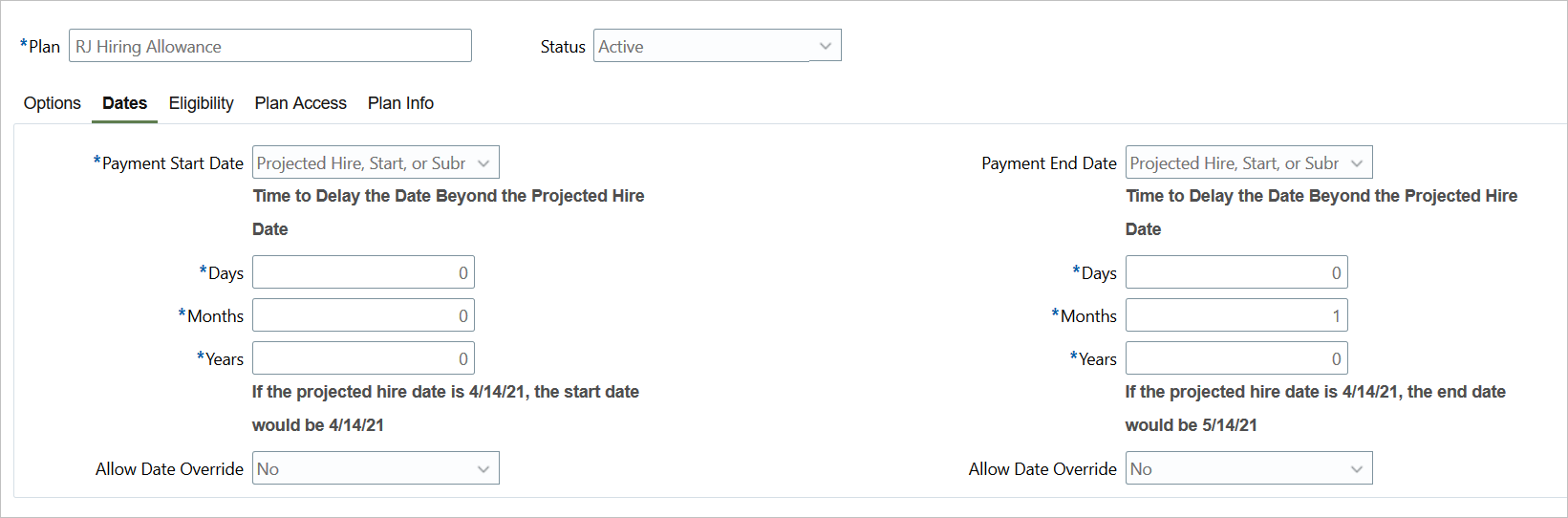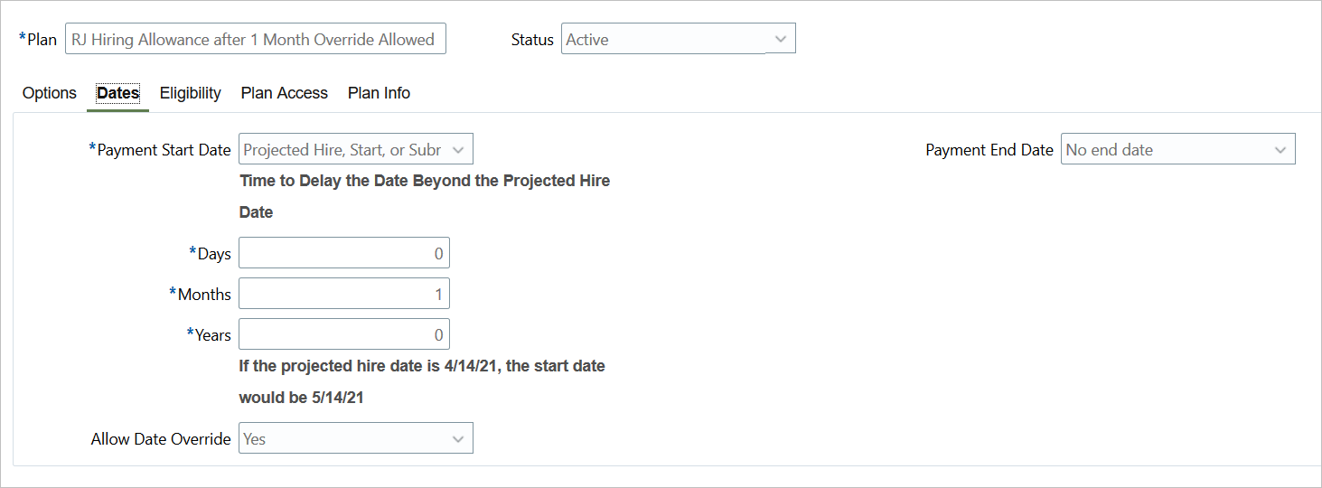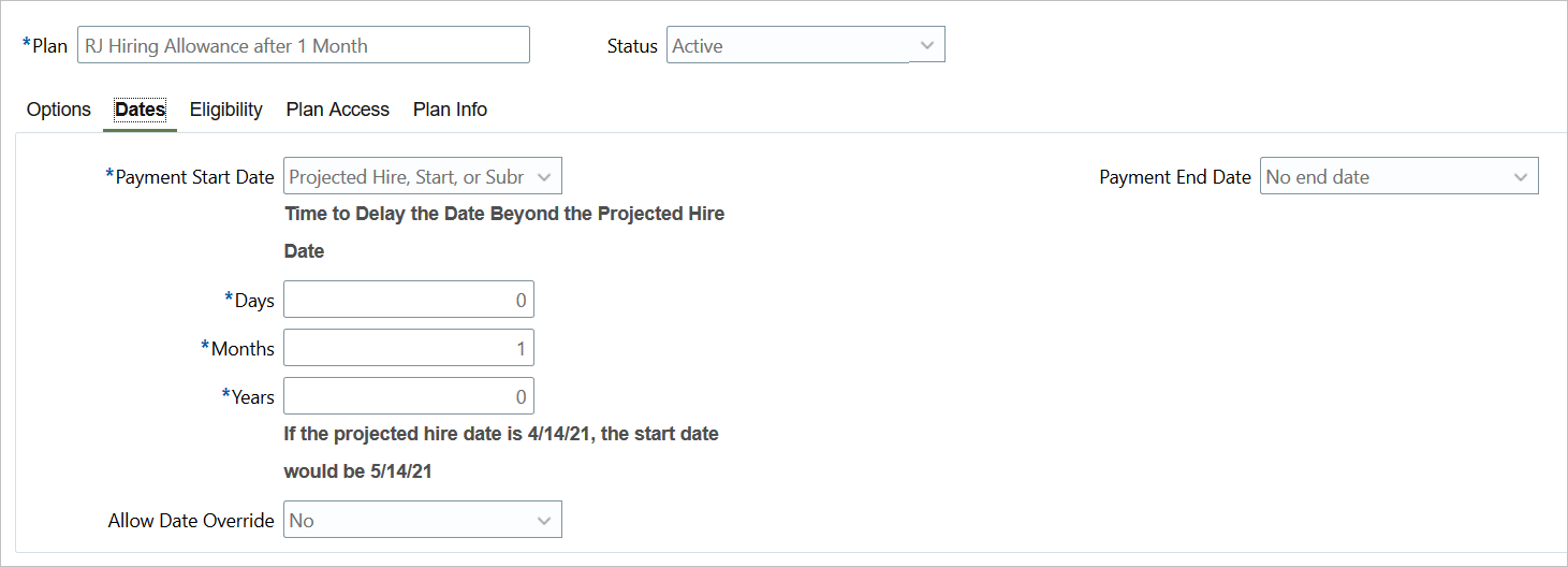 You can configure the imputed shell plan to calculate the imputed income as of the event date, that is the day when coverage starts, or the first of the following month, as per your requirements. If you have other special conditions to consider for calculating the date, you can use a formula of the Rate Start Date type. This is the same formula type you use for determining the rate start dates, so if you already have formulas for determining the date, you can use the same formula here without recreating one.