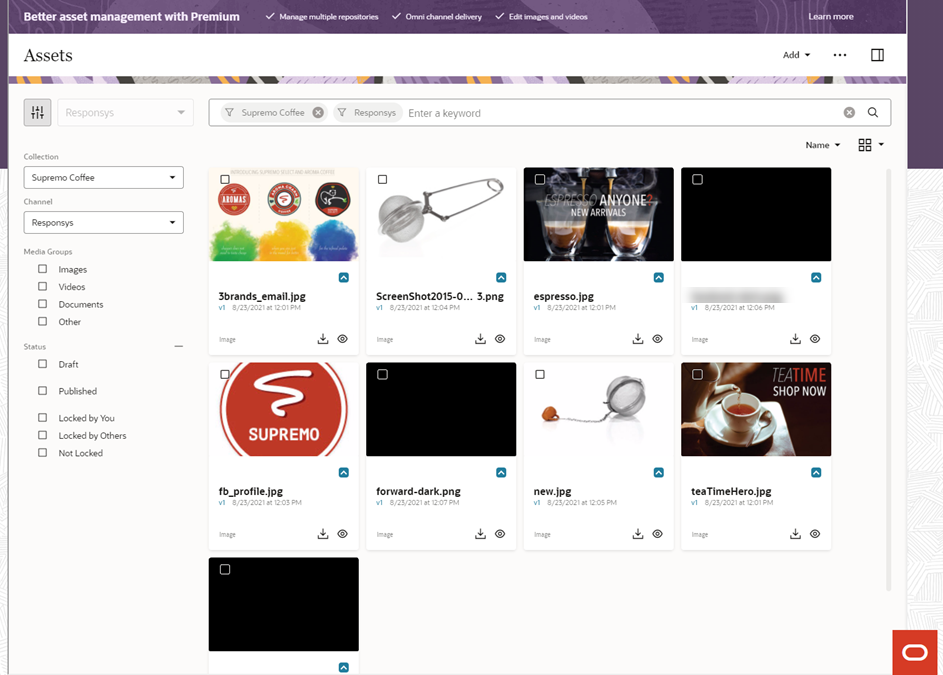 Oracle Responsys Express includes Oracle Content Management (OCM) Starter Edition as its asset management platform. OCM offers ready-to-use digital asset management capabilities and enables you to create, manage, and distribute assets. You can:
