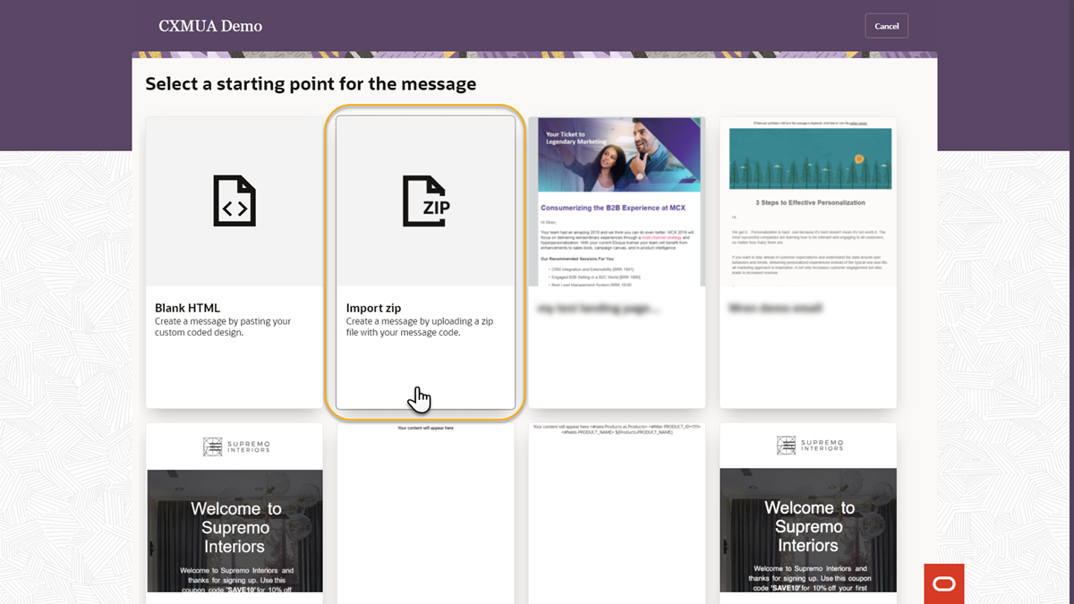 Uploading a ZIP file enables you to get started with creating messages in Oracle Responsys Express quickly.