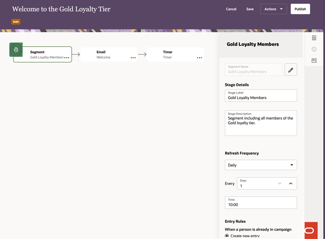 - Use segment membership stages to conditionally route contacts down different pathways in the campaign.