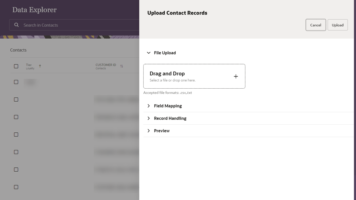 With Data Management, you can review, manage, and update your data model as needed. Use the Data Explorer to upload customer contacts and view customer contact data.