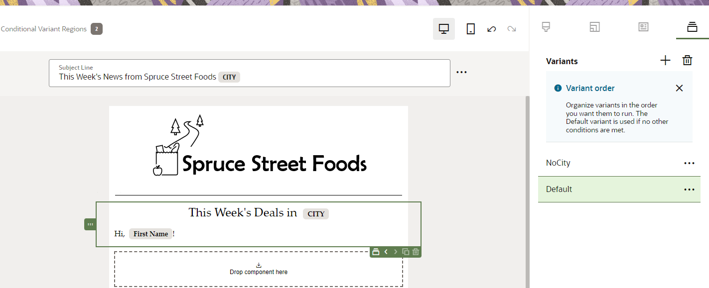 When a Subject Line or a message body region in the Message Designer visual editor has variants, a new set of controls lets you display the variants and navigate between them quickly.
