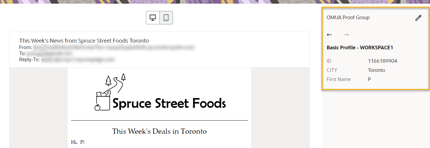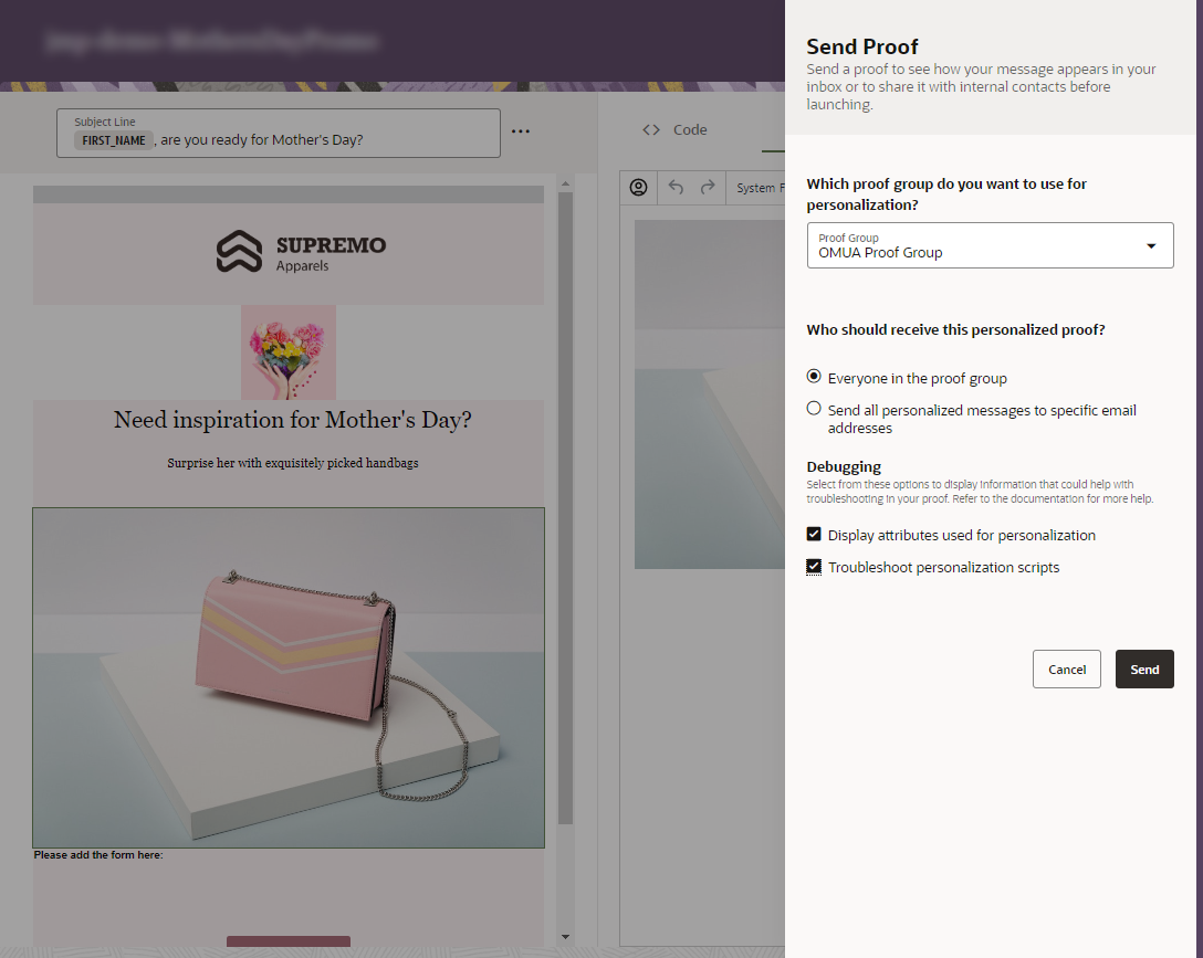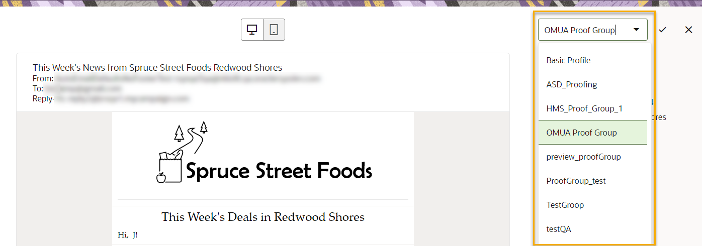 Proof groups provide a reusable group of test recipients, so that you can quickly select recipients to send a proof. Sending a proof lets you see how your message looks before you use it in a campaign. For example, you can validate that the variants and personalization attributes work as intended.