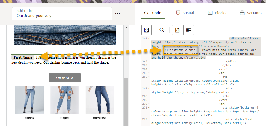 Token format is a marketer-friendly view that makes it easier to see which attribute you are using for personalization. It also visually distinguishes personalization attributes from the surrounding content.