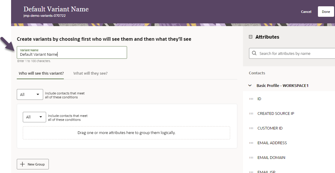 The first step in creating message variants now combines naming the variant and defining who will see it, so that you can create a meaningful name for the variant more easily.