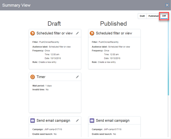 In the Program Summary View, you can now use a new view called Diff that provides a side by side comparison of your Draft and Published version of your Program.