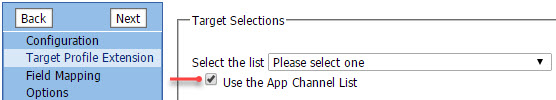 - In the Target Profile Extension step of the Import Profile Extension Data Connect job, select the list and select the new Use the App Channel List check box.