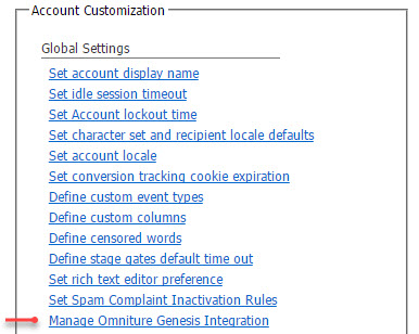 - In the Account Customization section of the Account Management page, select the new Manage Omniture Genesis Integration link to open the Omniture Genesis Integration page.