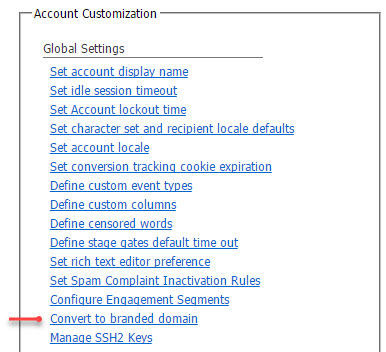 - In the Account Customization section of the Account Management page, select the new Convert to branded domain link to open the Convert to branded domain page.