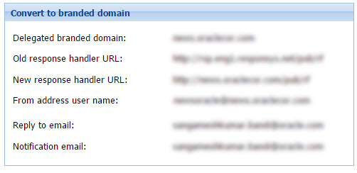 - On the Convert to branded domain page, specify the branded domain name, user name to use as the default 'from' user, and the email address to receive a notification when the conversion is complete, then click Submit.
