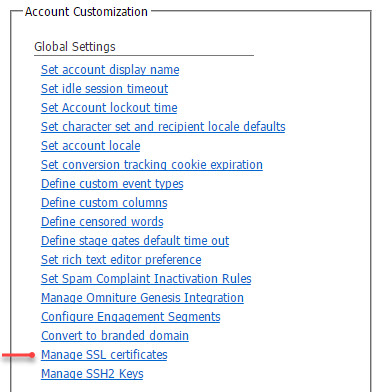 - In the Account Customization section of the Account Management page, select the new Manage SSL certificates link to open the Manage SSL certificates page.