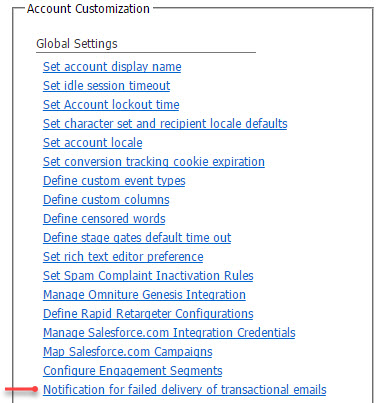 - In the Account Customization section of the Account Management page, select the new Notification for failed delivery of transactional emails link to open the Notification for failed delivery of transactional emails page.