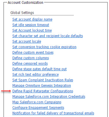 - In the Account Customization section of the Account Management page, select the new Define Rapid Retargeter Configuration link to open the Rapid Retargeter Configuration page.