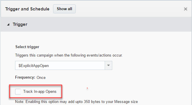 . - In the Trigger section, select the Track In-App Opens checkbox.