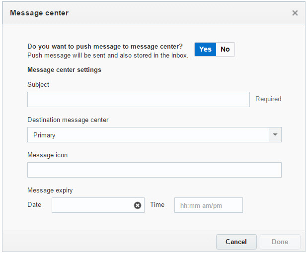 We enhanced the Push Campaign Designer to allow the campaign designer to send Push notifications to the Message Center and to set preferences for those messages.